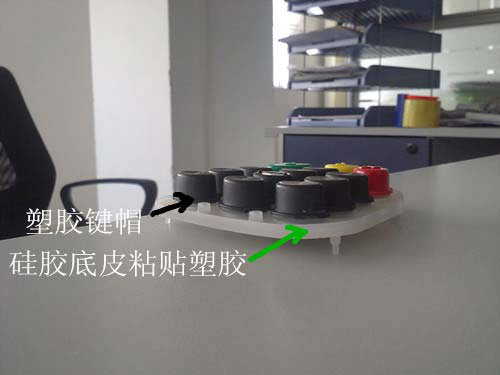 這款產品就是一款典型的P+R按鍵,產品包含上面三種顏色的塑膠鍵帽,塑膠鍵帽的字體是通過表面移印字符的,然后再通過底部的硅膠內襯按鍵和塑膠鍵貼合而成的硅膠制品。