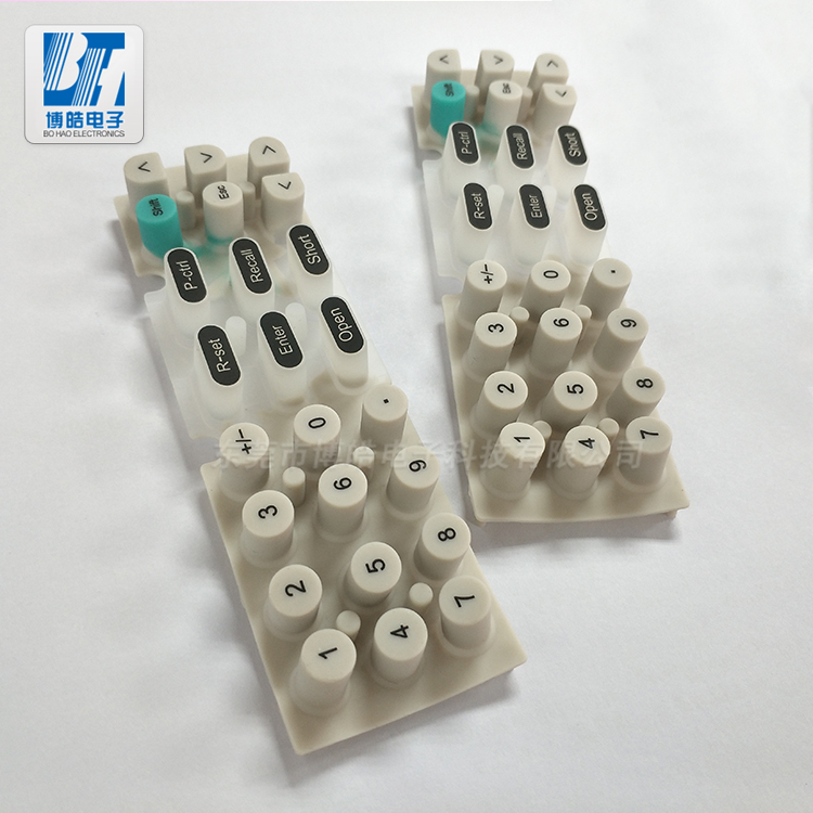 - 微機綜保按鍵,硅膠材質(zhì),采用多色成型和絲印工藝,該按鍵經(jīng)過荷重耐摩擦的測試,在博皓電子共有32臺油壓成型機可以保障大批量訂單交期穩(wěn)定。